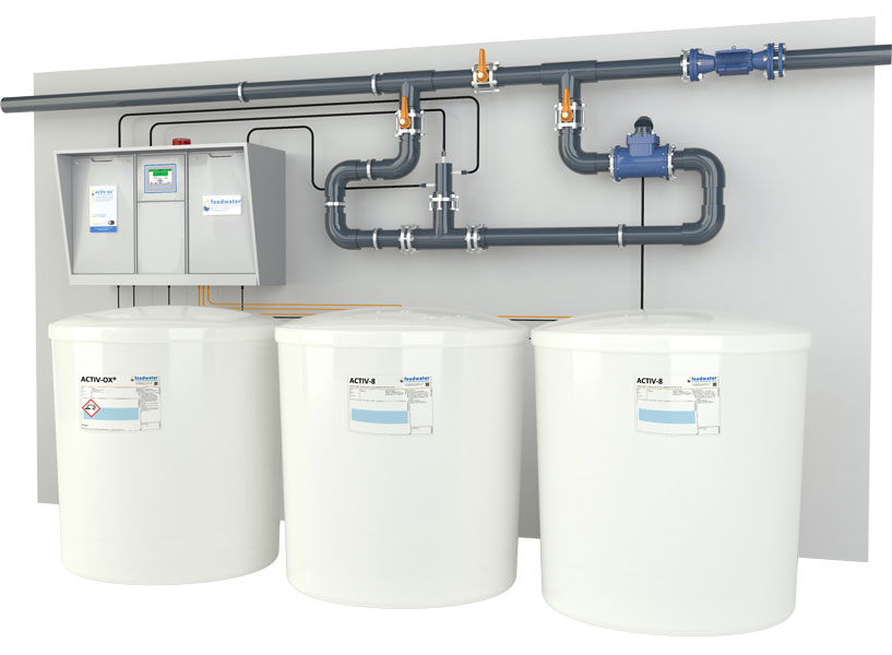 The Activ-Ox 4200 series system is built to cope with high flow rates and high dosage volumes and is suitable for commercial & industrial sites with significant water usage. Incorporating everything from the 3200, the 4200 doses from three chemical precursor chemicals rather than two to reduce chemical volume which means fewer chemical deliveries are required.